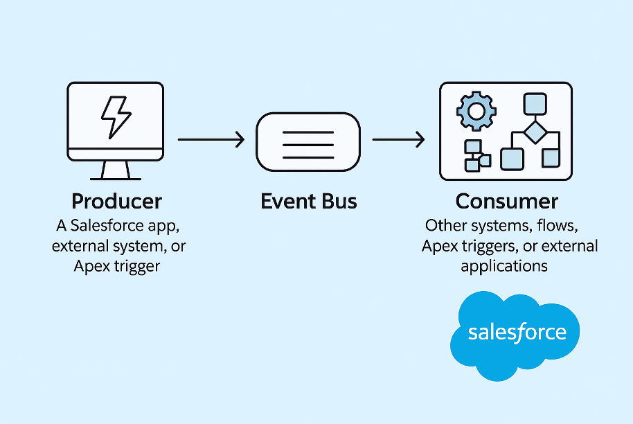 Consumer: Other systems, flows, Apex triggers, or external applications subscribe to the event and act once it’s received.