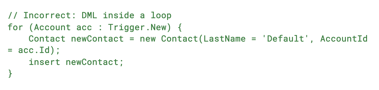 If you see a SOQL query or a DML statement inside a loop—stop and refactor. Move the operation outside the loop, gather your data in collections, and process it in bulk.