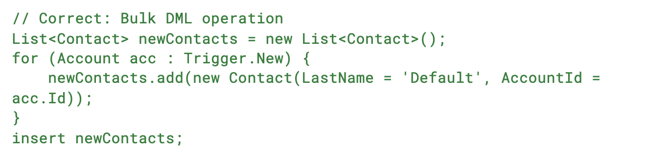 By collecting all contacts into a list and inserting them at once, we reduce the number of DML statements from 200 to 1—a major performance and reliability boost.