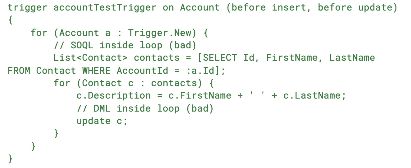 If your code runs a query or a DML operation inside a loop, and that loop iterates over 100+ records, you’ll hit these limits fast—and your transaction will fail with a governor limit exception.