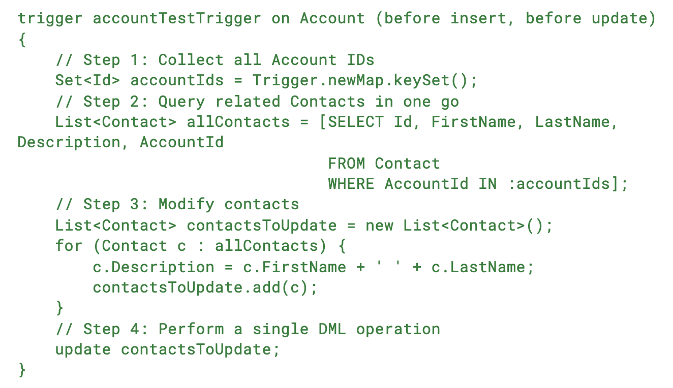 Bulkification isn’t limited to triggers. Any Apex code that processes records—such as batch jobs, invocable methods, or API handlers—should be built with bulk handling in mind. Using collections (Lists, Maps, Sets) and performing batch operations helps make your code scalable and governor-limit-safe.