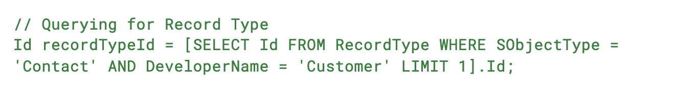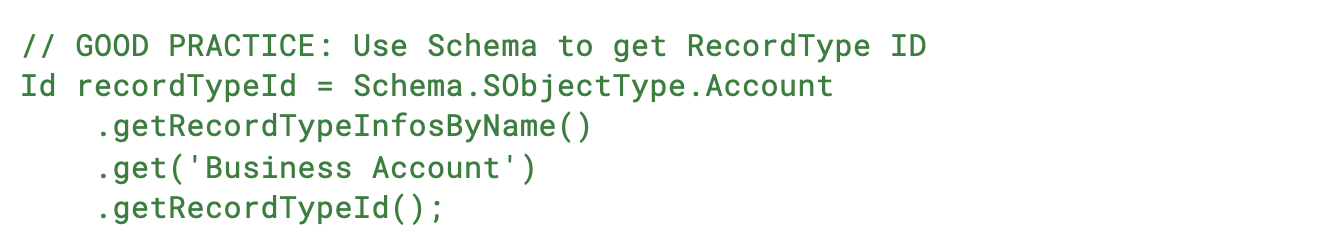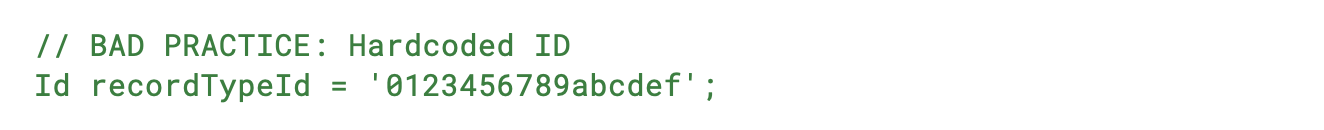 Hardcoded IDs work perfectly in your sandbox, but they will likely fail when you deploy your code to a different environment. That’s because Salesforce generates unique IDs for each record in each org. Even if you create the same object or record type in production, its ID won’t match the one in your sandbox.