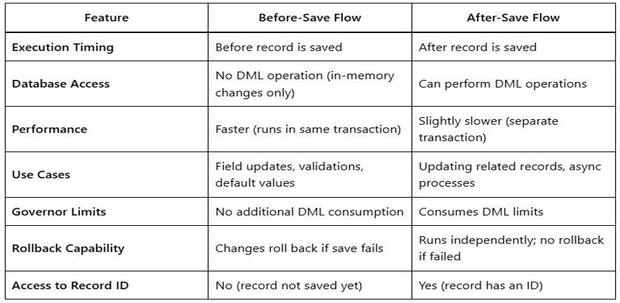Before-Save: Ultra-fast. Updates happen in-memory during the save operation, avoiding an extra database update. No extra DML is required, and execution can be up to 10x faster than after-save flows.